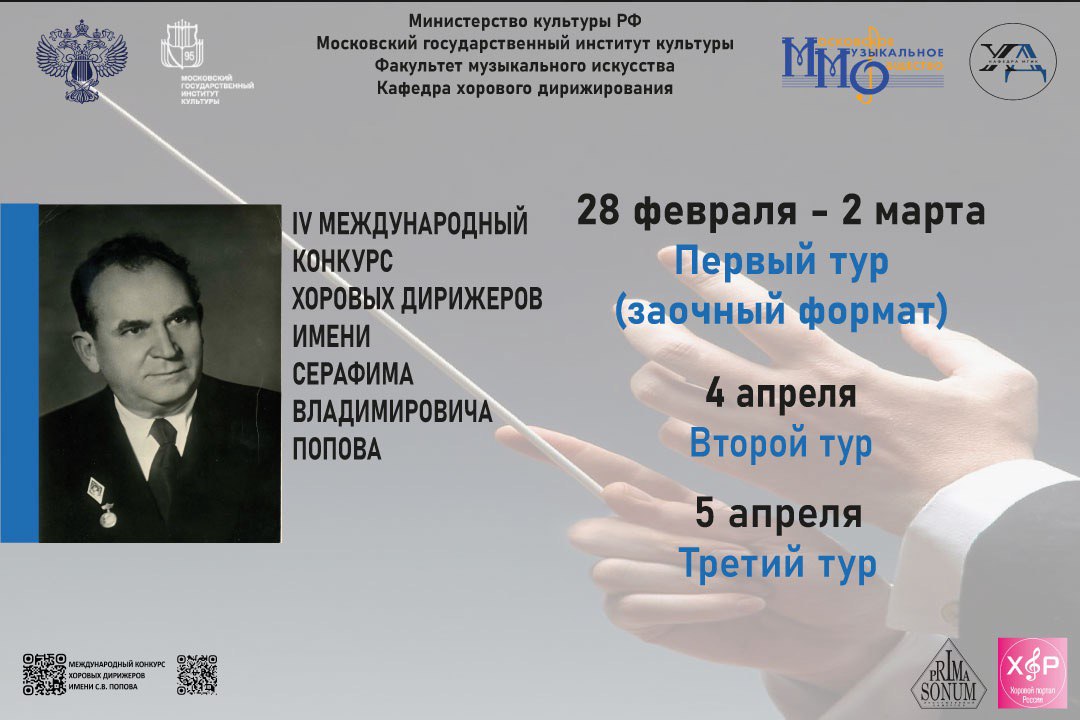 Московский государственный институт культуры при поддержке Министерства культуры Российской Федерации и Московского музыкального общества проводит IV Международный конкурс хоровых дирижеров имени Серафима Владимировича Попова. Мероприятие посвящено памяти выдающегося хорового дирижера, заслуженного деятеля искусств РФ, профессора, основателя кафедры хорового дирижирования МГИК Серафима Владимировича Попова (1904–1986).